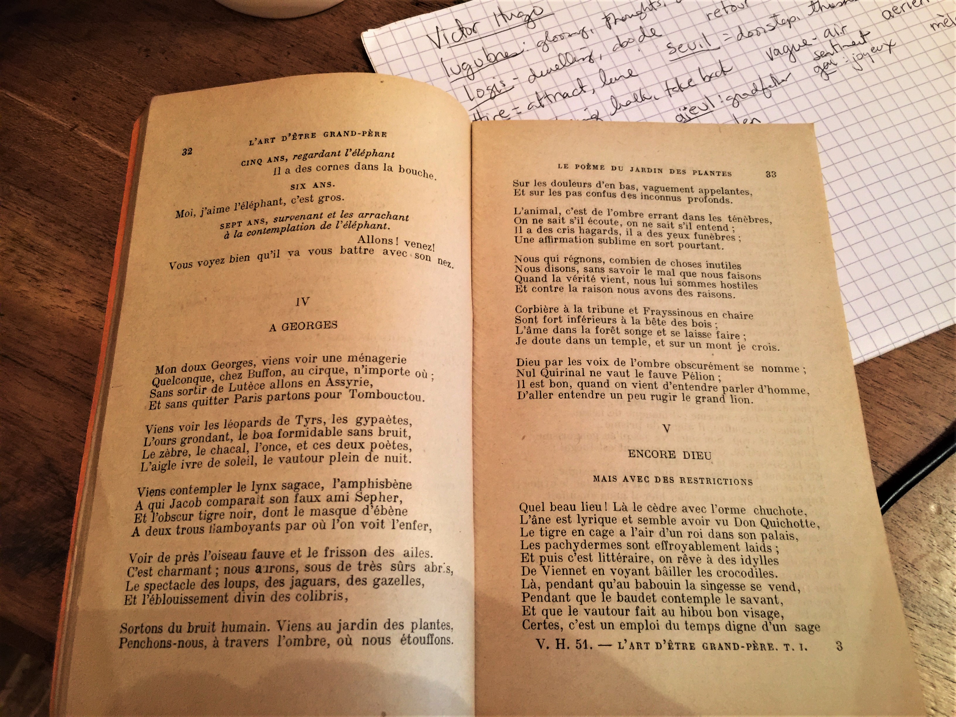 This post is the first in a series of my translations of Victor Hugo’s poems about the Jardin des Plantes in Paris. Victor Hugo wrote ten poems about his experiences of taking promenades in the Jardin with his grandchildren, Georges and Jeanne. Hugo wrote two volumes for L’art d’etre Grand-Pere in 1877 and they … Continue reading Translating Hugo: Jardin des Plantes IV, A Georges