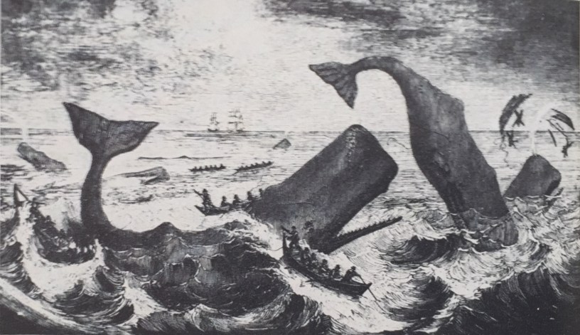 The origin of Melville’s whaling story came from the journals of the Essex of Nantucket, which was rammed and sunken by a gigantic sperm whale in the Pacific Ocean in November,1820. After a 4-year whaling voyage of his own, Melville would read the account of Owen Chase who survived the sinking of the Essex and write about the incident in Narrative of the Most Extraordinary and Distressing Shipwreck of the Whale-Ship Essex.