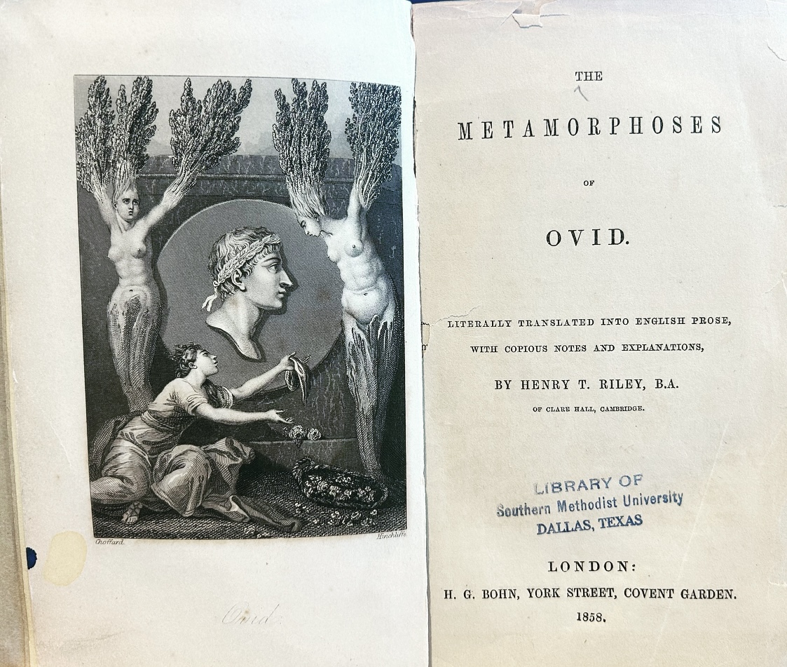 For this blog, I am referencing a very fragile 1858 edition The Metamorphoses of Ovid: Literally Translated into English Prose, with Copious Notes and Explanations, by Henry T. Riley, B.A. of Clare Hall, Cambridge. Much appreciation to the SMU Fondren Library for loaning this treasure from your Permanent Collection!