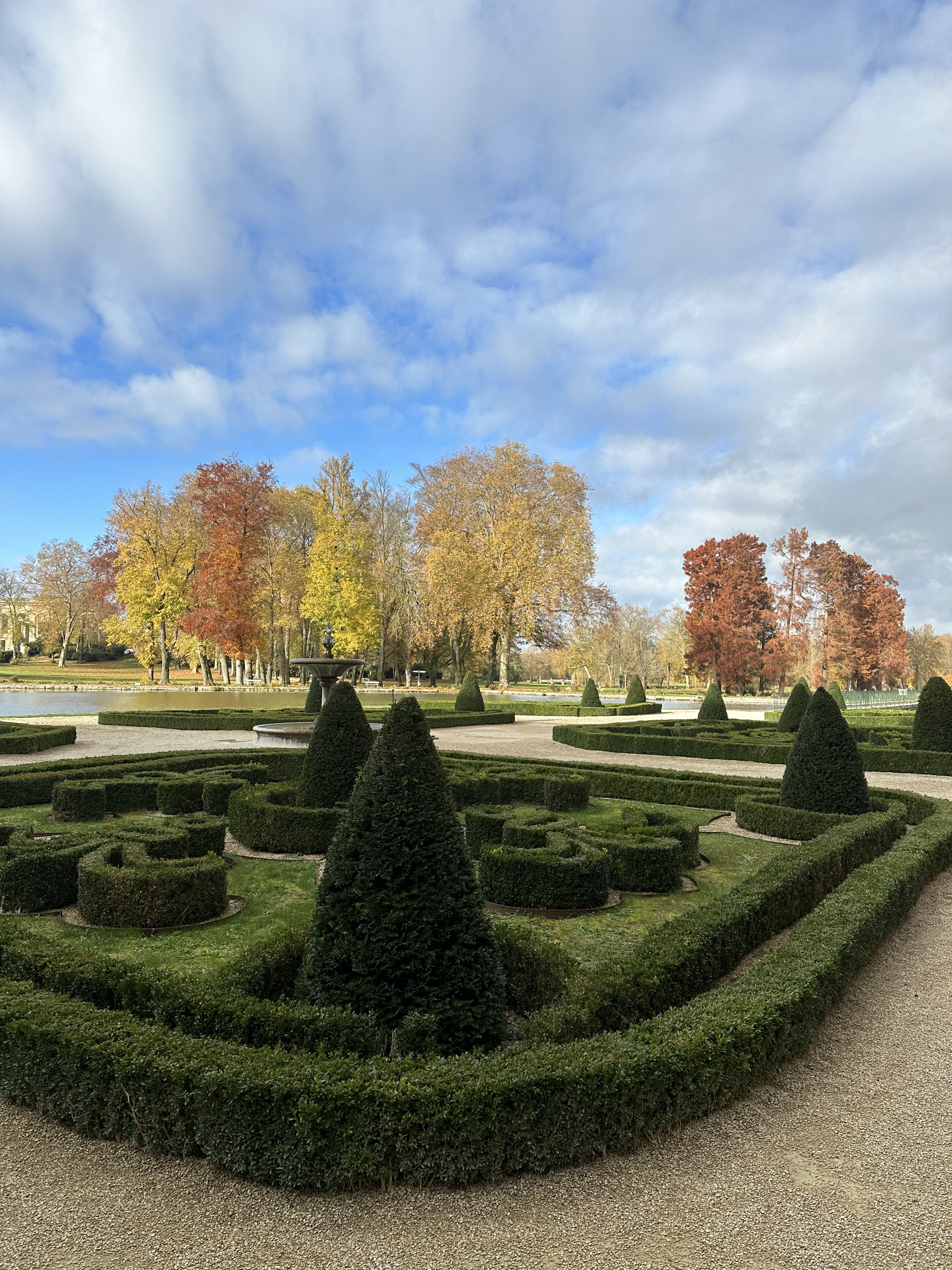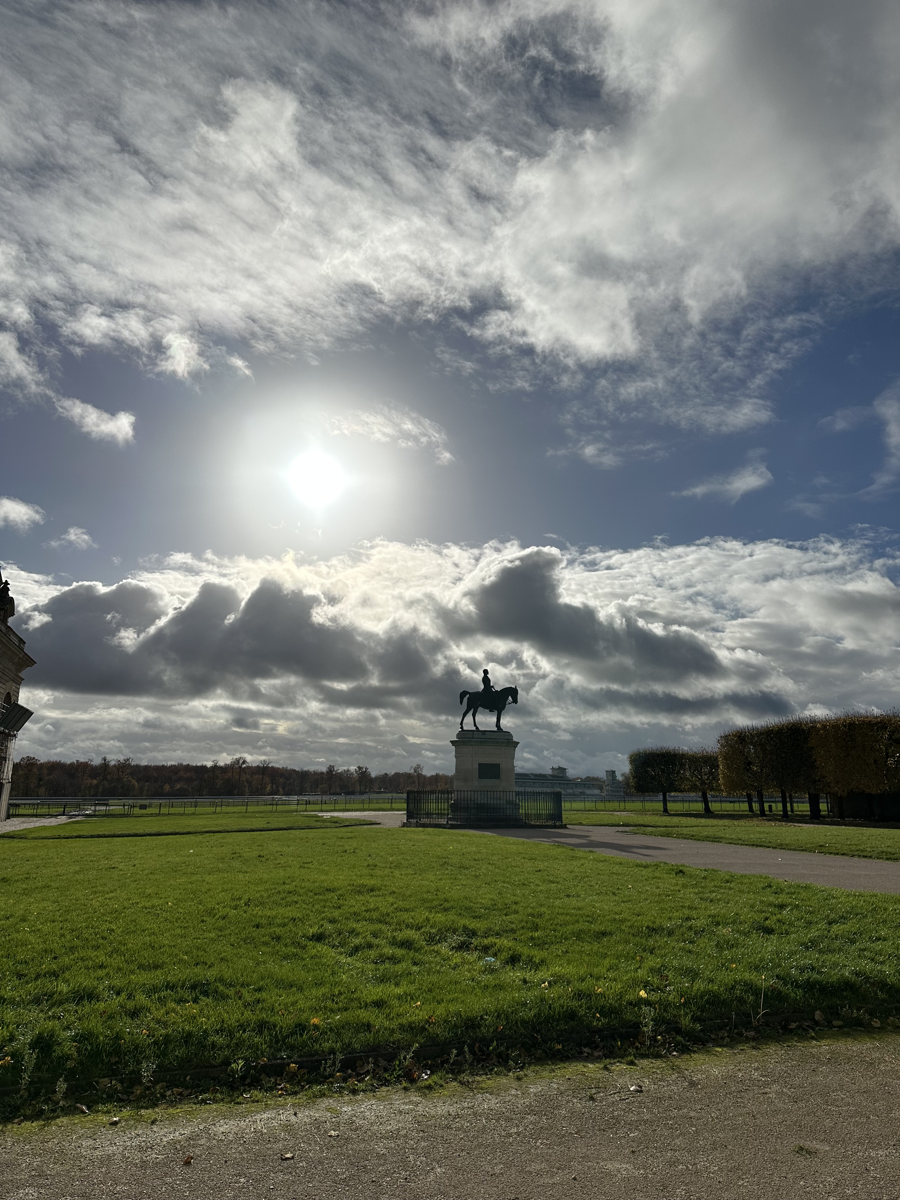 When we arrived at Chantilly Gouvieux station, there were two options. We could take a bus to the chateau, which was a 15-minute ride, or we could take a 25-minute walk. We opted for the walk because we saw the sign for that sooner and it was a pretty fall morning. The walk was really beautiful through some woods and then an open pasture. We passed by Chantilly Racecourse (horse race tracks) and the horse stables connected to the Chantilly Chateau. The gates to the chateau opened at 10 a.m. We arrived shortly after, so we were able to go right in and start the tour.