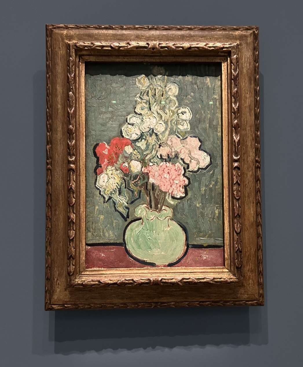Vase aux fleurs (Juin 1890): Van Gogh Museum, Amsterdam, on my Bucket List—it was closed for renovation the two times I visited Amsterdam. Thank you, d’Orsay for including one of my favorite still life paintings in this Exhibit. The green vase contrasted by the white, pink, and red bouquet is so aesthetically pleasing. Classic.