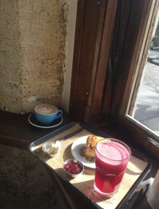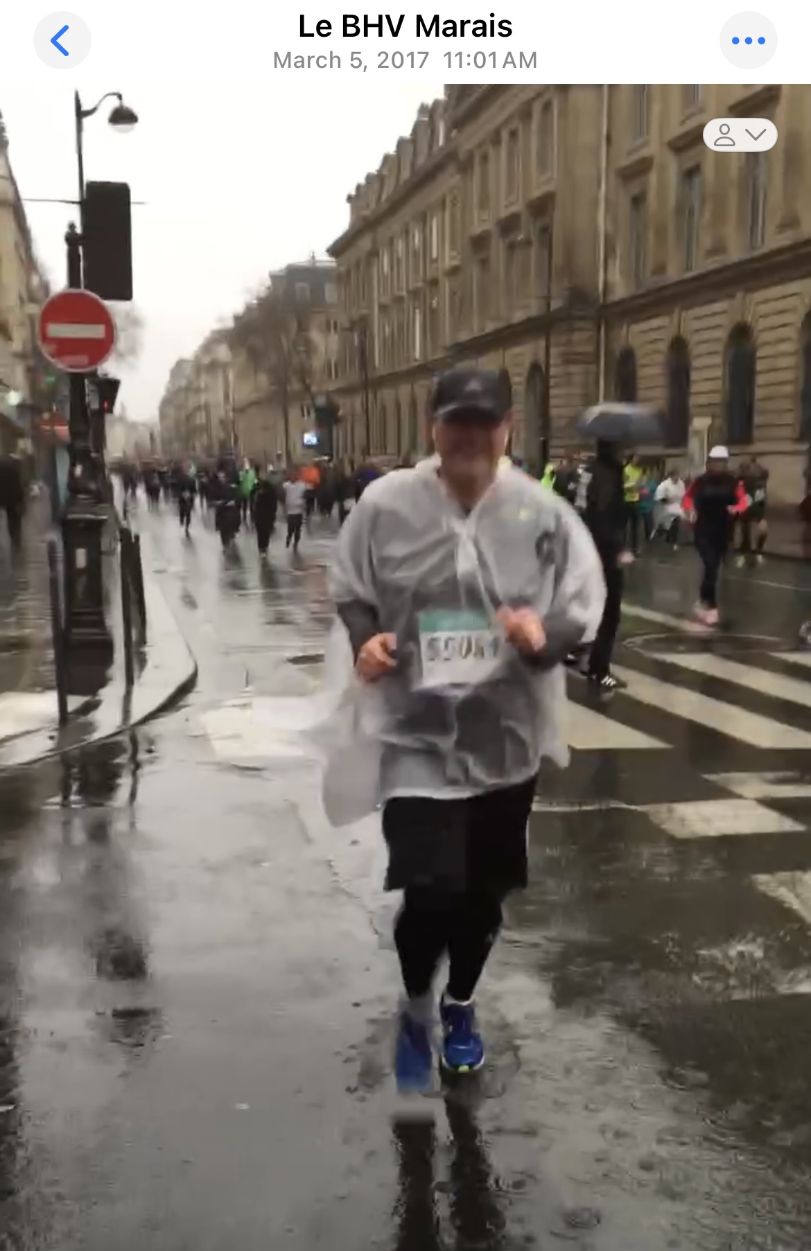 I positioned myself early in front of the Hotel de Ville waiting in the pouring rain. As this was our first Semi-Paris, I did not realize that nothing would be open early Sunday morning-no cafe to take shelter and warm up. No matter–cheering on the runners “Allez, Allez, Super, Super” — kept me full of adrenaline and anticipation that I would see David soon, amid the sea of 35,000 runners. What a wonderful moment when he rounded the corner, kissed me on the cheek, and rejoined his group.