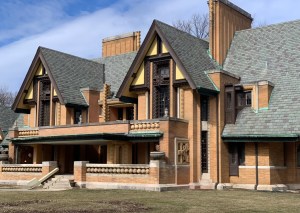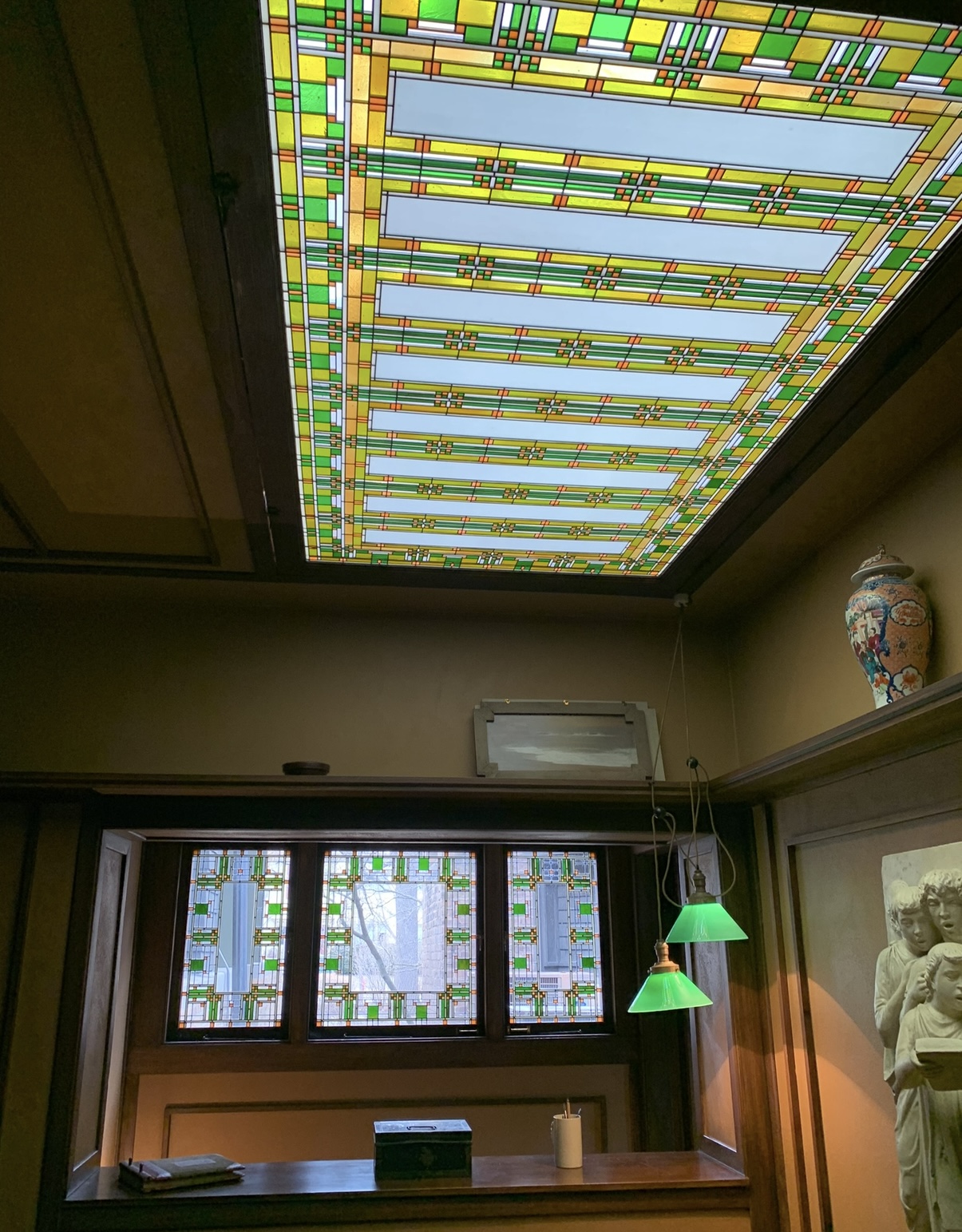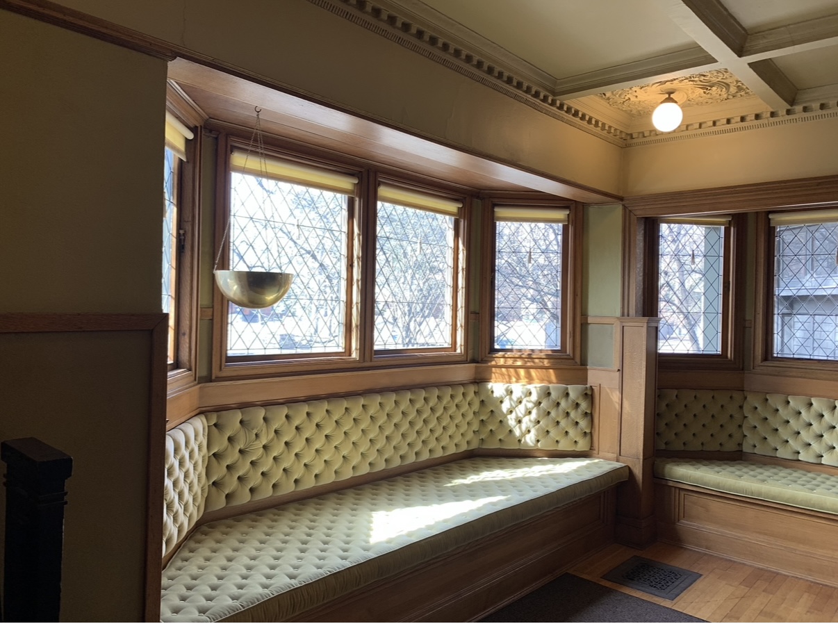 I am picturing in my mind one of my favorite American neighborhoods to visit– Oak Park, Illinois, which is populated by many of Frank Lloyd Wright’s Prairie Style houses built at this time with strong horizontal lines, wooden built-in furniture in geometric figures, tiffany glass, and front porch swings! (I highly recommend the Wright tour of homes!)