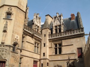 2) interior: includes plafonds, caissons, large fireplaces with rectangular mantles, and ornate sculptures with gothic influence. The gothic flamboyant style was reconstructed in the Abbey of Cluny with its profound voutes, detached garden in the back, and on the rue Saint-Martin. Additionally, the first table with feet was introduced alongside the high-back armchairs, and the four-poster beds.