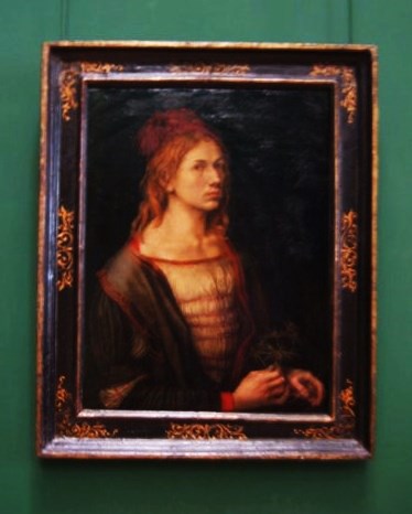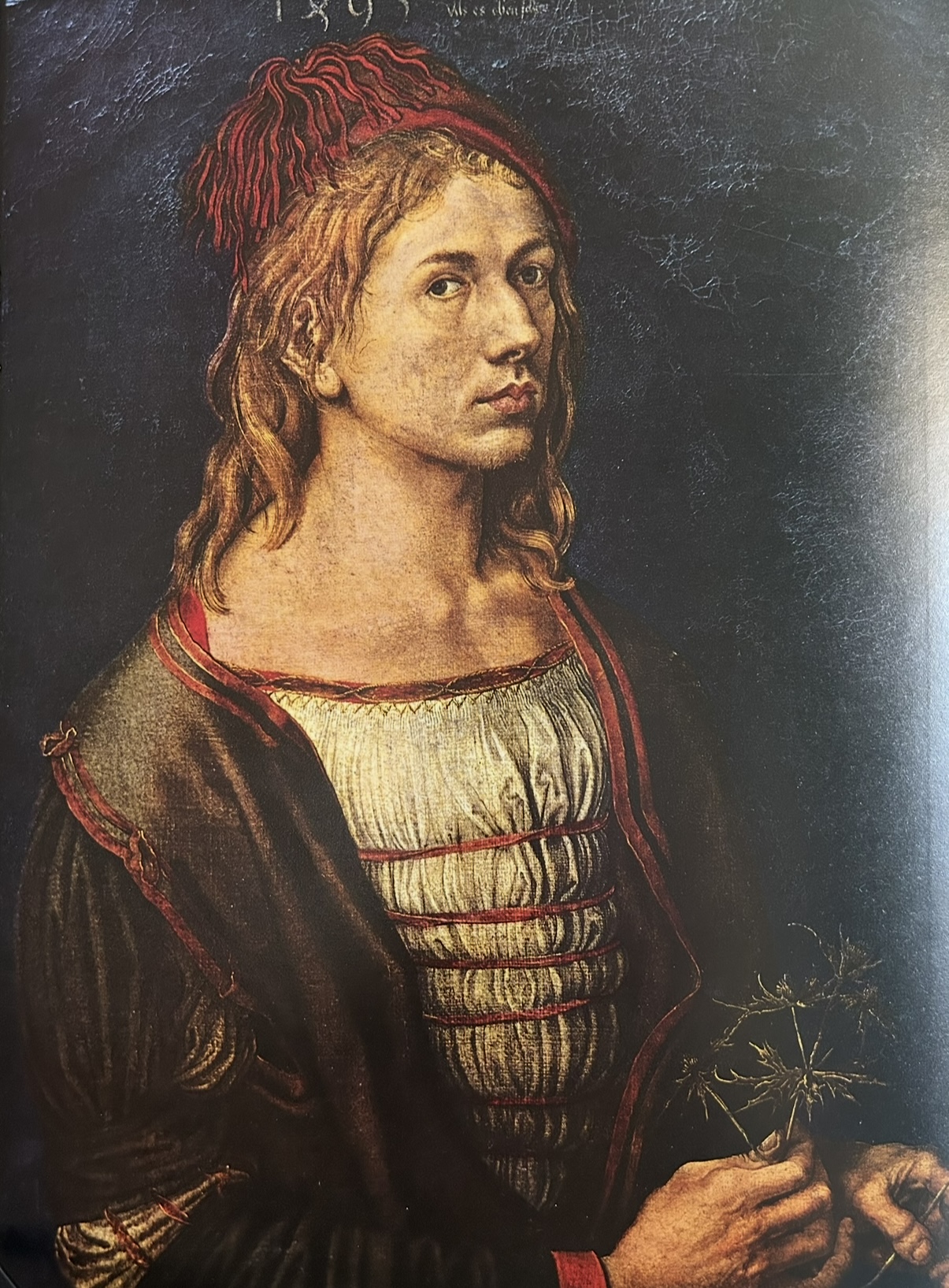 His “Self-Portrait with Eryngium Flower”, part of the Musée du Louvre permanent collection, was painted on vellum and, according to Peter Strieder in Dürer, this suggests that this portrait was painted in the workshop in Strasbourg. The date, 1493, also suggests that this was from his journeyman’s period when he was trying to impress on his fiancée in Nuremberg that he was handsome (10). He achieved this goal!