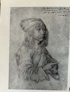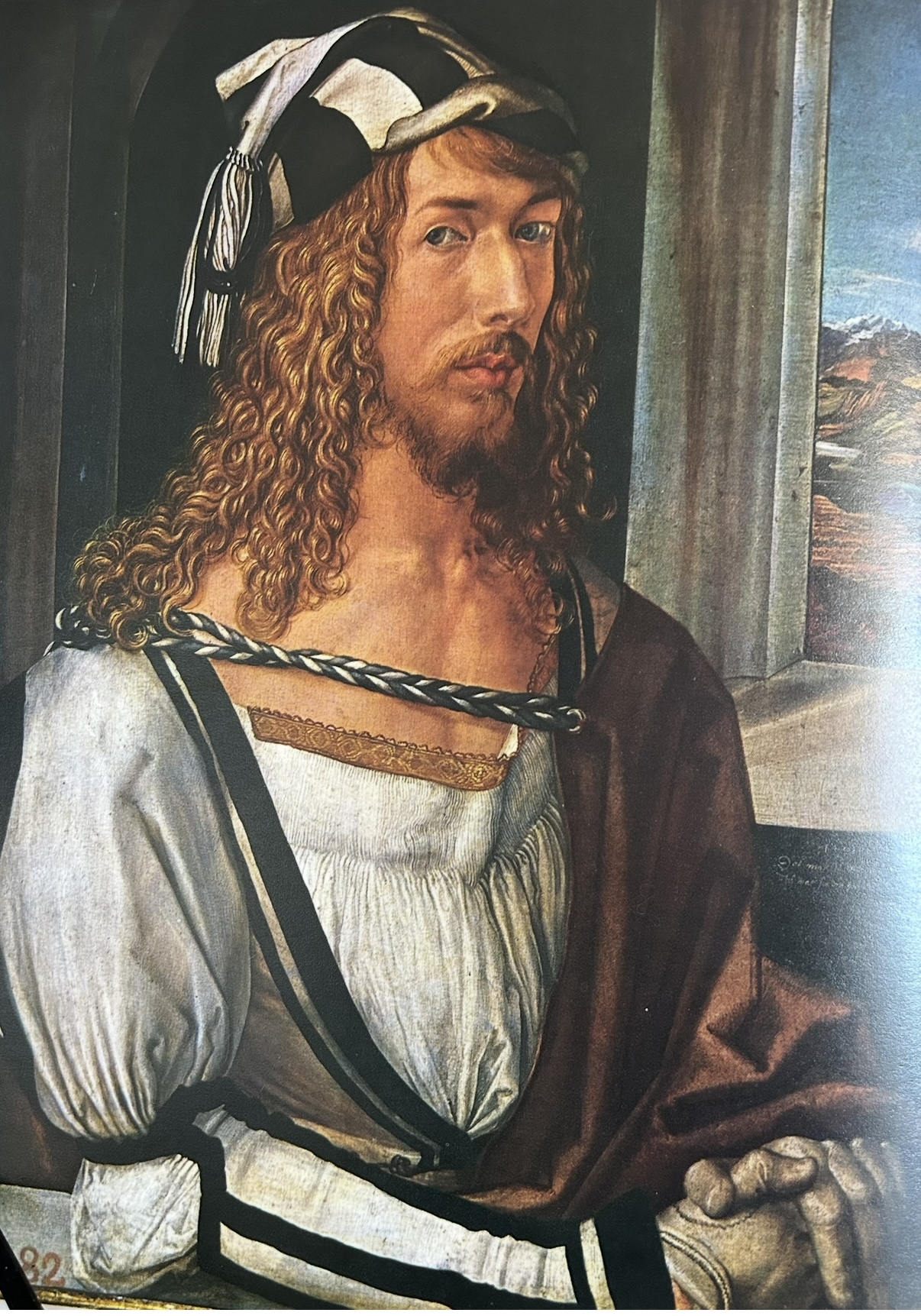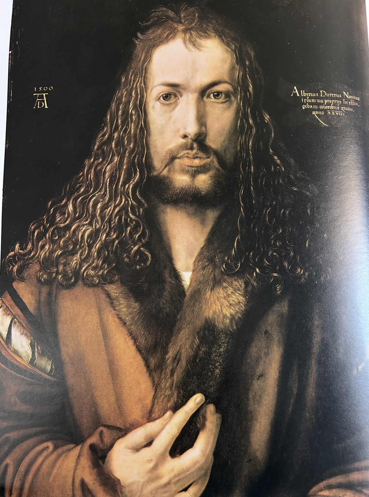 At a time when there were no traditional “mirrors”, Dürer made a self-portrait at the age of 13 which I recently viewed at the Albertina in Vienna. It is intriguing—what or who is he pointing at? It is amazing that he could capture such great detail in his clothing, his hair, and his expression at such a young age.