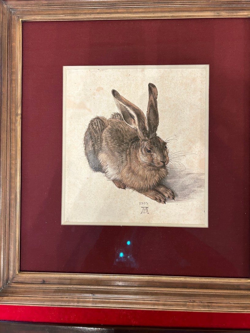 This is an almost scientific study of the animal but with a warm glow of yellow hues. He is so lifelike, cowering timidly, warily on the lookout and ready to leap up and race off. The reddish and grayish tones stand out from the white of the paper. I was able to view the original watercolor in April of last year at the Albertina! So cool.